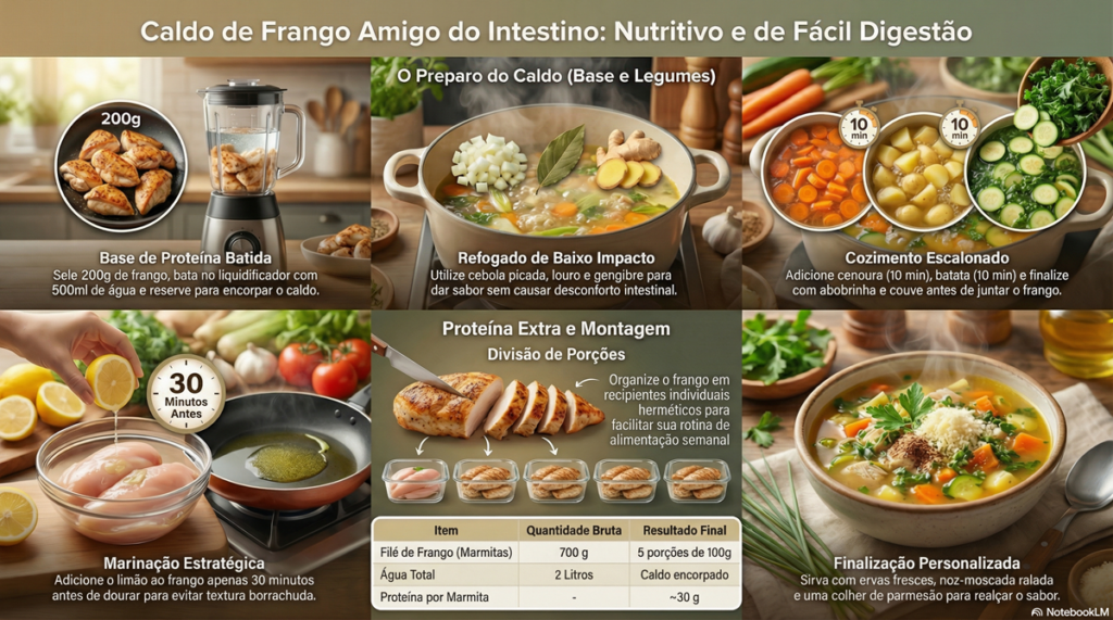 Na base desse caldo terá proteína batida, porém é interessante acrescentar uma porção extra de proteína para alcançar pelo menos 100g de peito de frango por porção.