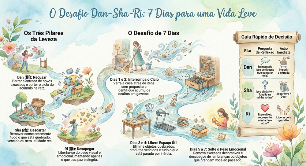 No sétimo e derradeiro dia do desafio Danshari, alcançamos o ápice do processo: o desapego profundo e energético daquilo que realmente nos aprisiona internamente. Este é o momento crítico de lidar com itens caros guardados apenas por culpa financeira, roupas de épocas passadas que não servem mais ou presentes ligados a pessoas e fases difíceis da vida.