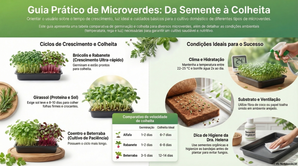 Outras opções incluem manjericão, chia e grama de trigo. O manjericão apresenta aroma intenso e pode ser utilizado em diversas preparações culinárias. A chia produz folhas delicadas e crescimento rápido. Já a grama de trigo é frequentemente utilizada para preparo de sucos verdes e bebidas à base de vegetais. Essa diversidade de espécies permite variar sabores, texturas e cores na alimentação cotidiana.