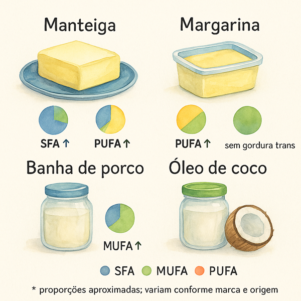 Dia a dia: prefira azeite extra-virgem e outros óleos ricos em MUFA/PUFA; deixe a banha para receitas pontuais.